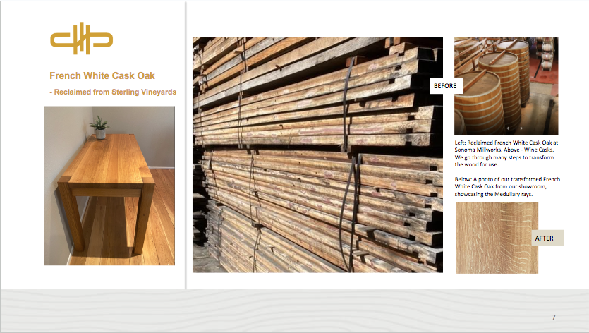 We handcraft custom tables, sliding barn doors and more.. to your specifications. We offer locally salvaged slabs such as Olive Wood Burls, Walnut, Bay Laurel, Acacia, & French Oak. We transform reclaimed French Oak inner wine tank staves into our exclusive VinoPlank. We create beautiful functional art for you from reclaimed Douglas Fir from the San Francisco Ferry Building & Mare Island, Old Growth Redwood from Beaulieu Vineyard in Napa, reclaimed Wine Cask Oak and more! The possibilities are endless!